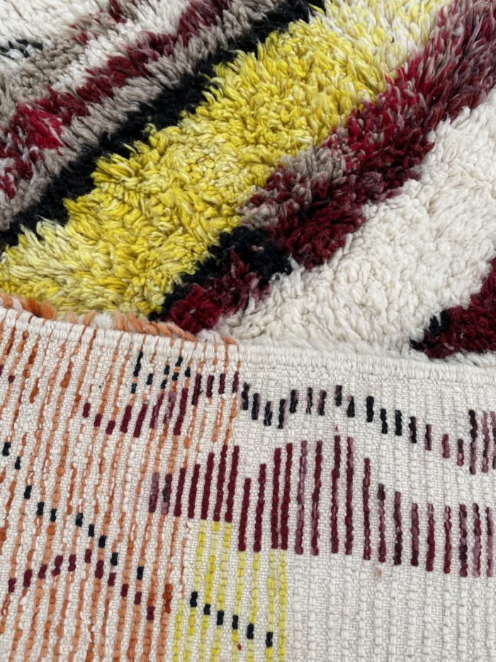 The Moroccan Beni Ouarain carpet is composed of 100% natural Marmoucha wool. A naturally thick wool (long wool yarn), and silky (short wool yarn), that is much sought after.