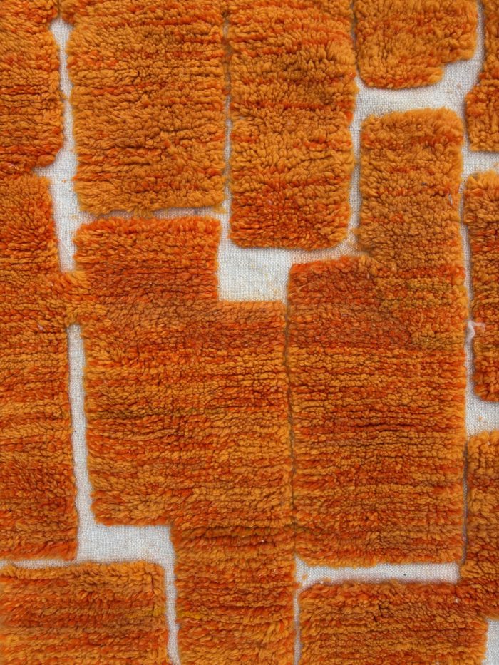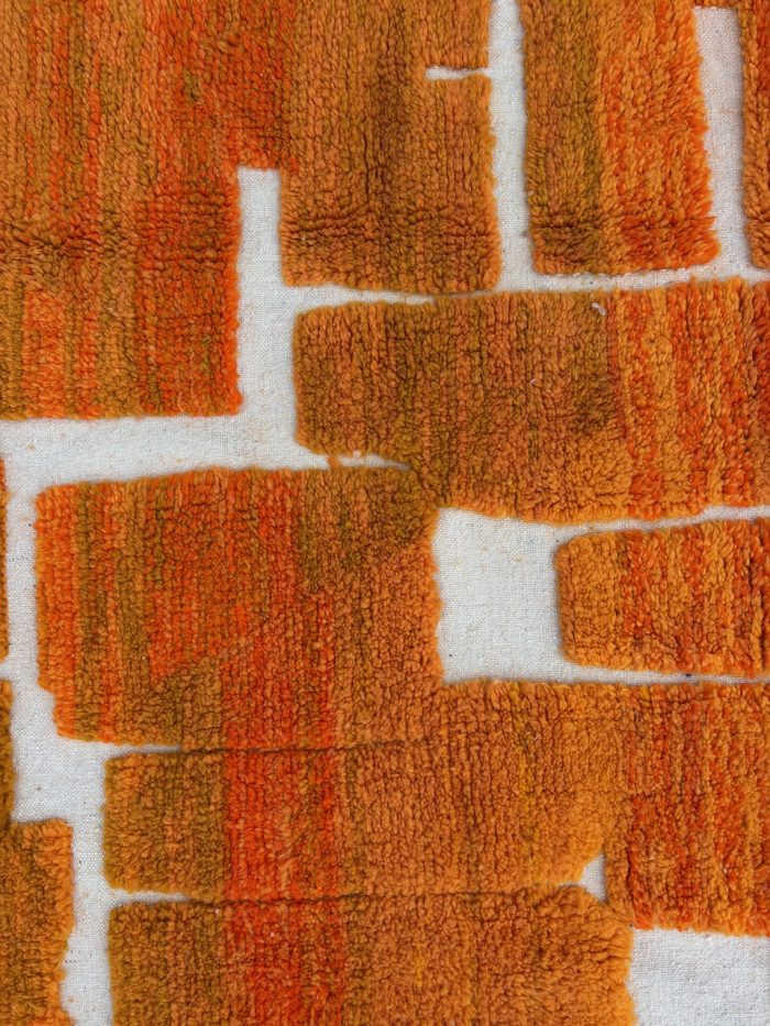 This model features a structured graphic pattern, inspired by architectural and abstract shapes, in a warm, vibrant orange hue, perfectly balanced by a natural ecru background. A modern, artistic and timeless rug, ideal for a contemporary, bohemian or minimalist interior.