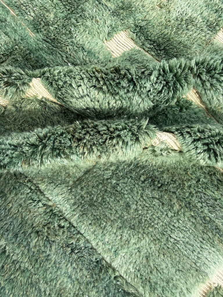 Égayez votre intérieur avec ce tapis marocain sur mesure aux tons verts uniques, entièrement tissé à la main par des artisans berbères.
