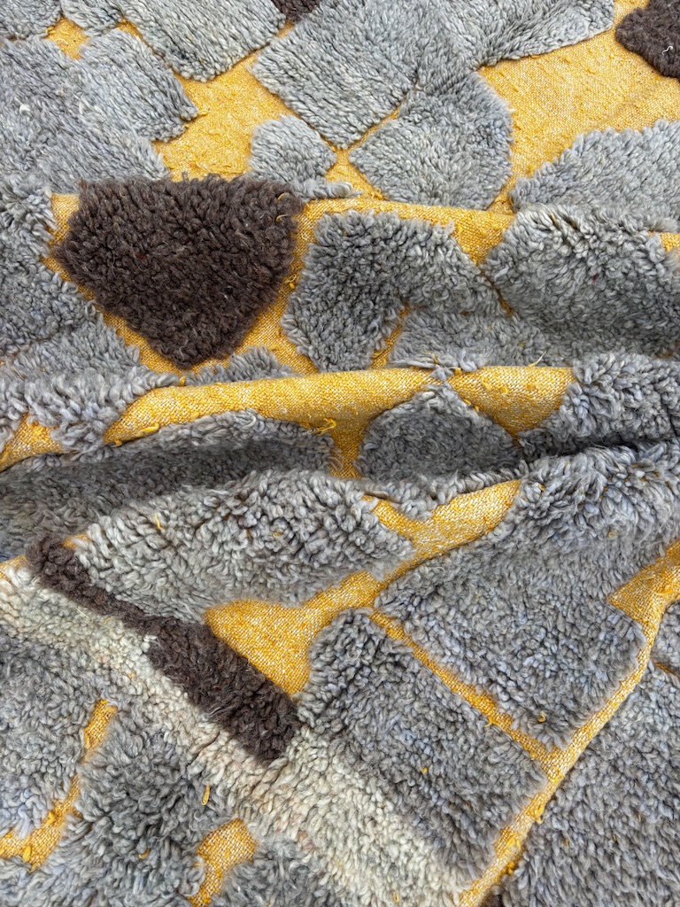Découvrez un tapis marocain Mrirt d’exception, entièrement tissé à la main dans la région du Moyen Atlas, célèbre pour la qualité incomparable de ses tapis en laine. Ce modèle au design contemporain mêle un fond jaune vif à une composition graphique de formes grises et brunes, créant un effet artistique unique, subtil et moderne.