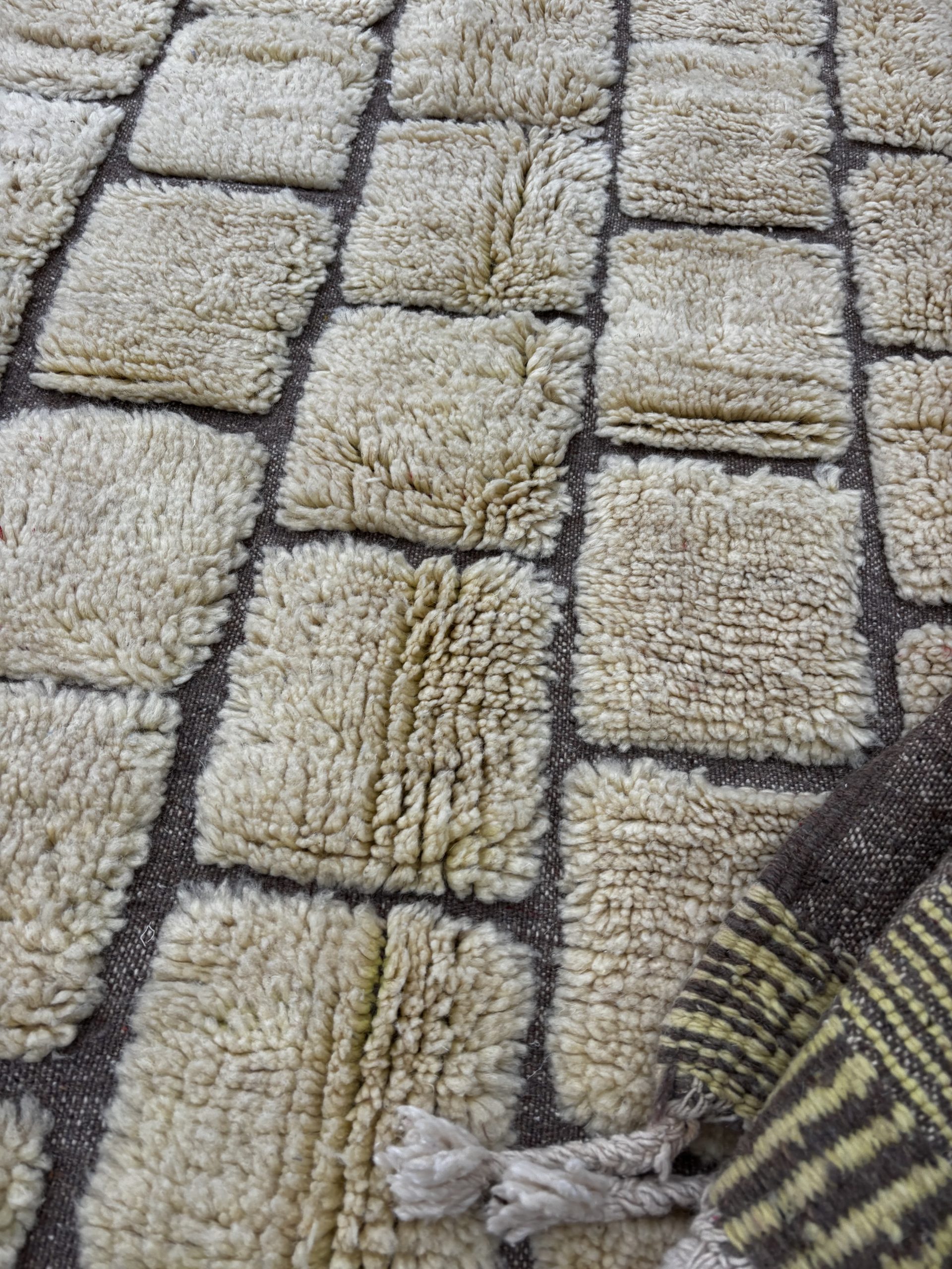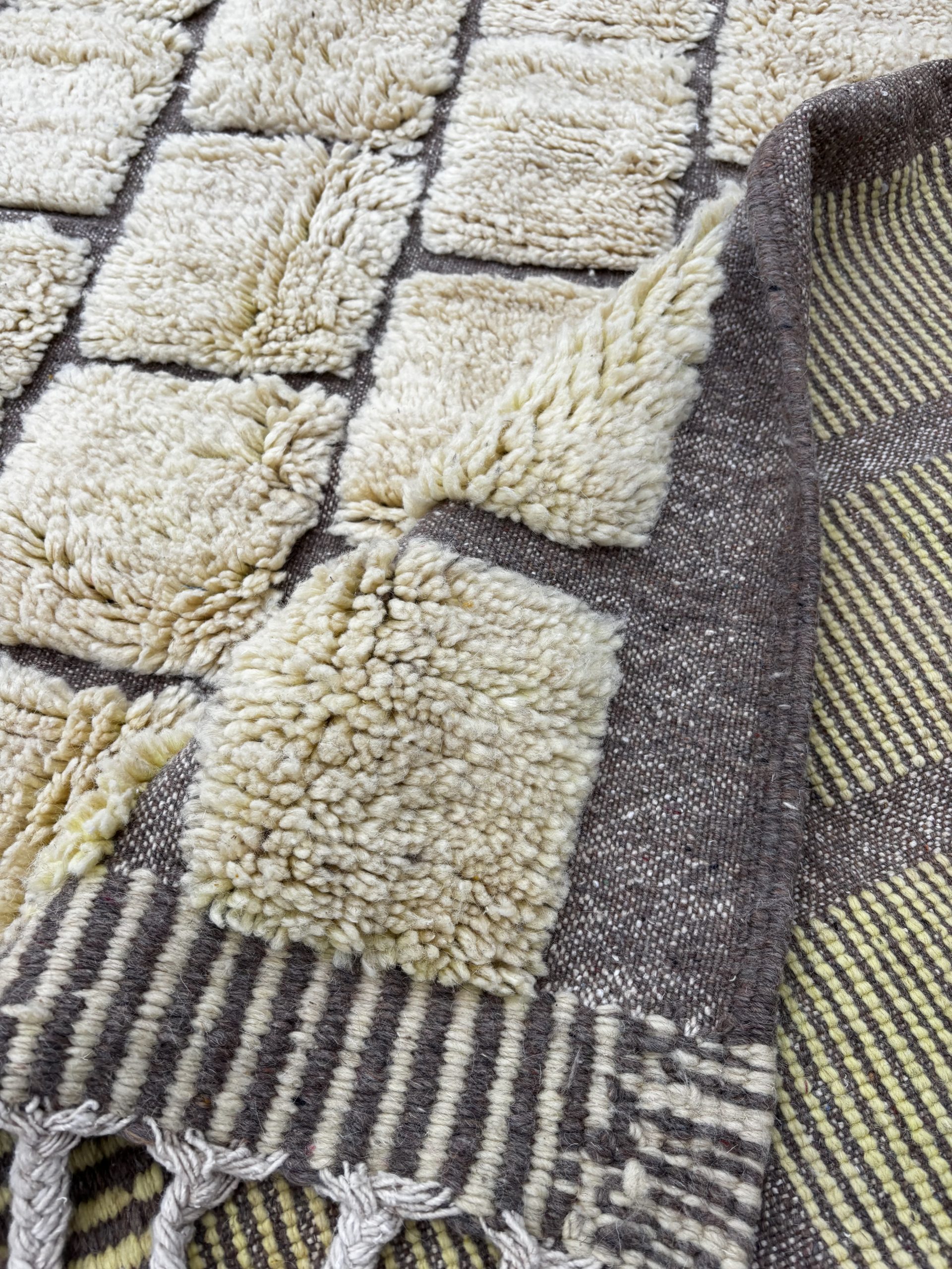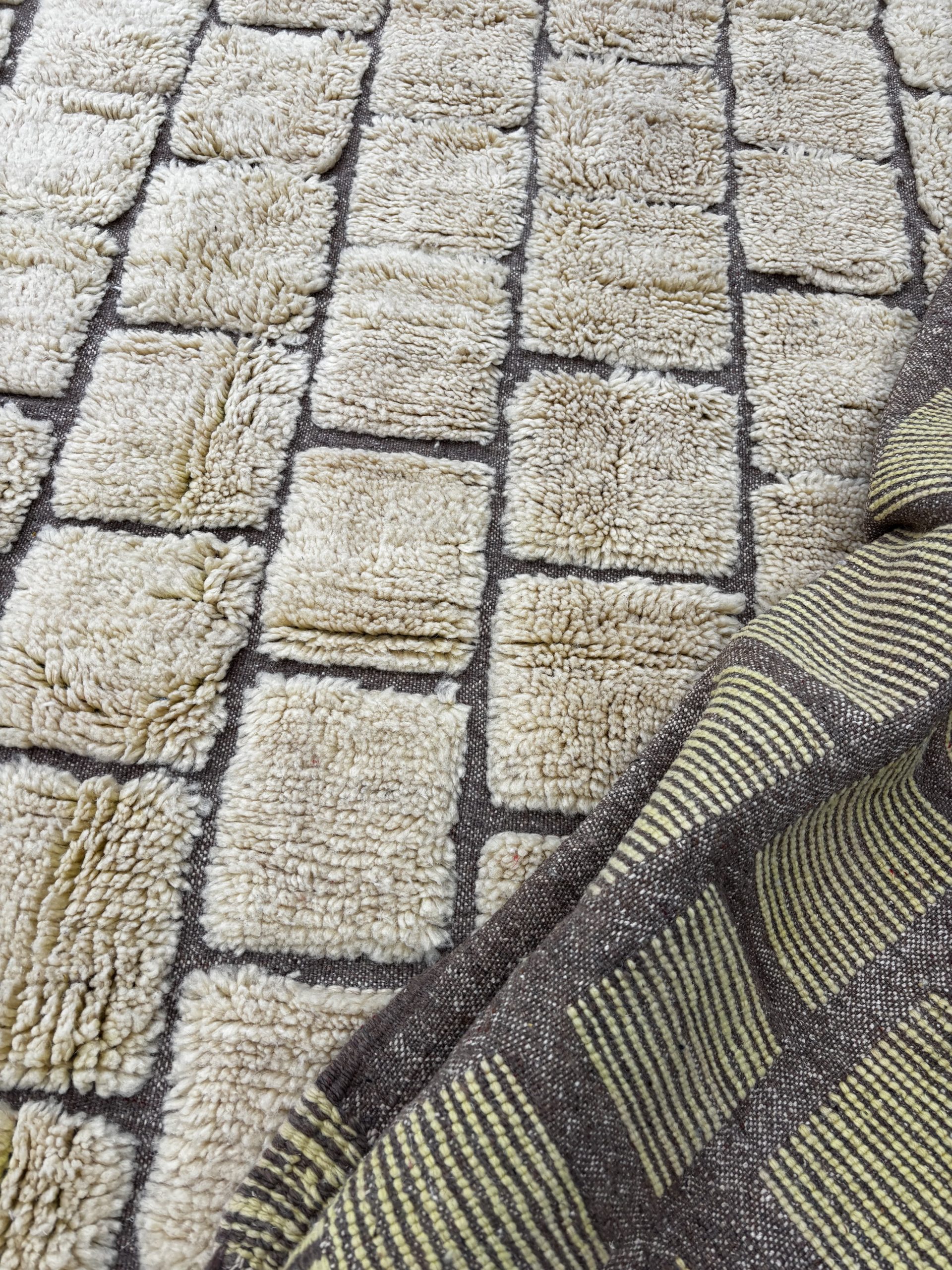Découvrez un tapis marocain Mrirt d’une finesse exceptionnelle, entièrement tissé à la main dans la région du Moyen Atlas. Reconnu pour sa laine luxueuse et son rendu irréprochable, ce tapis en laine naturelle se distingue par son motif géométrique moderne composé de blocs jaune doré subtilement texturés.