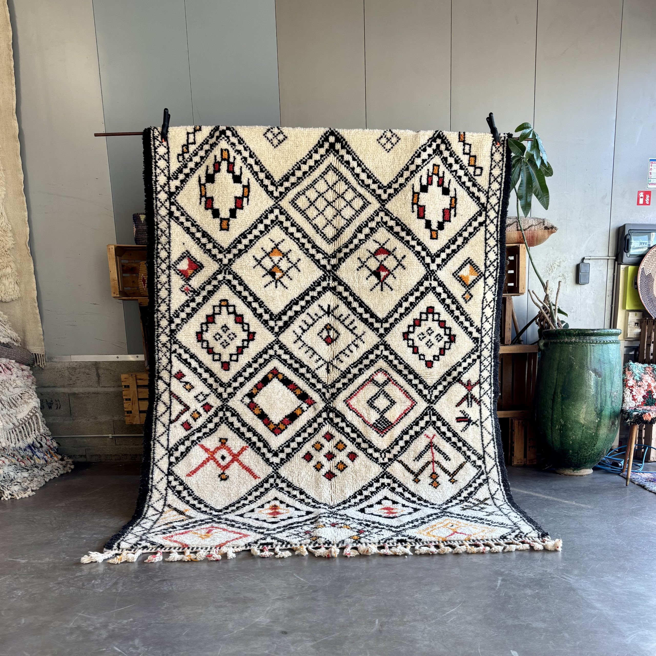 Ce tapis marocain Beni Ouarain est une pièce d’artisanat authentique, fabriqué à la main par des artisans berbères dans les montagnes de l’Atlas. Avec ses motifs géométriques subtils et ses couleurs naturelles, il apporte une touche d’élégance et de chaleur à n’importe quel intérieur. Ce tapis en laine 100% naturelle offre une texture douce et confortable, idéale pour les espaces de vie modernes ou traditionnels. Ses dimensions généreuses et ses finitions soignées font de ce tapis un choix parfait pour ceux qui recherchent une décoration à la fois chic et intemporelle. Ajoutez ce tapis Beni Ouarain à votre collection pour enrichir votre décoration d’intérieur avec une pièce authentique et durable.