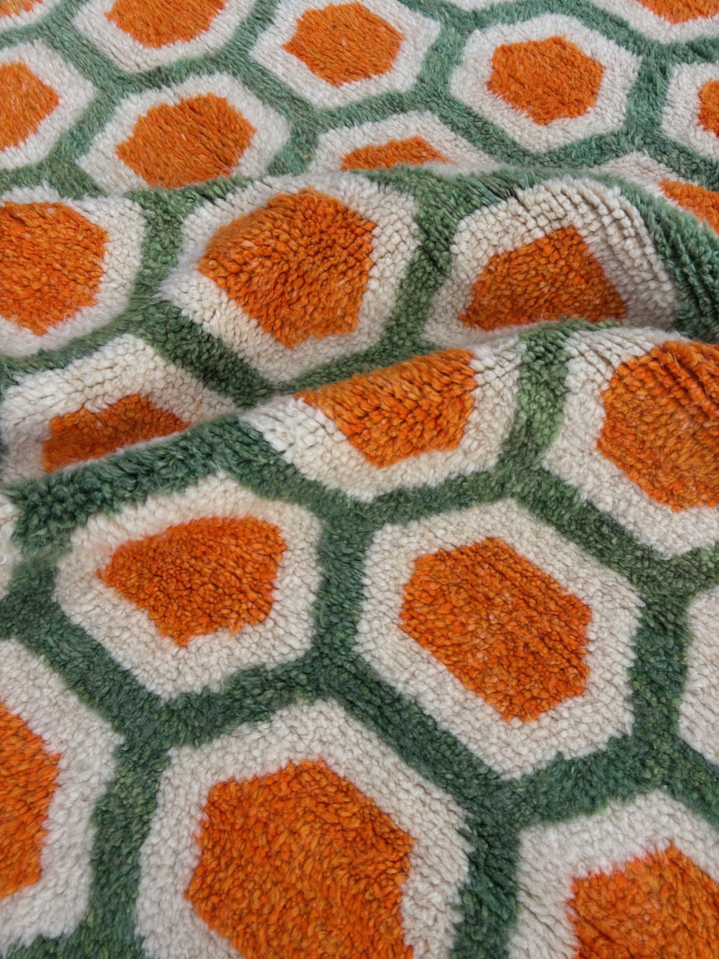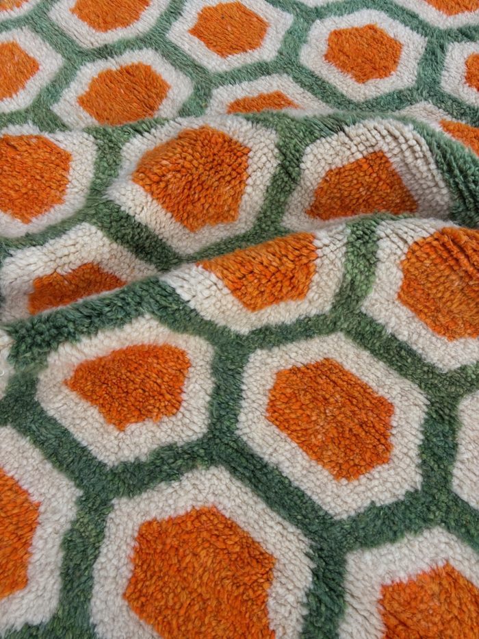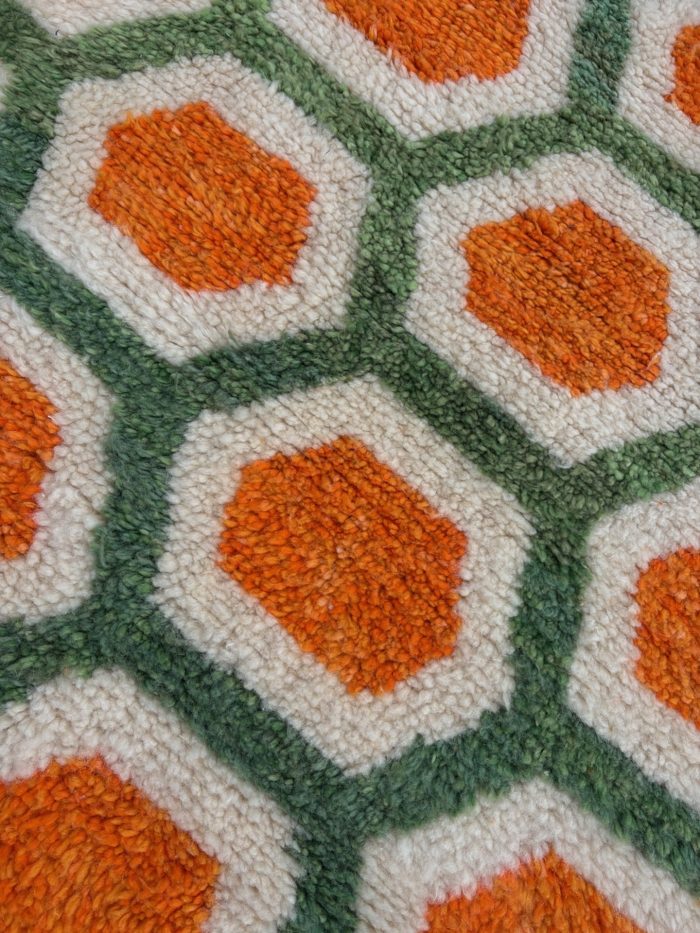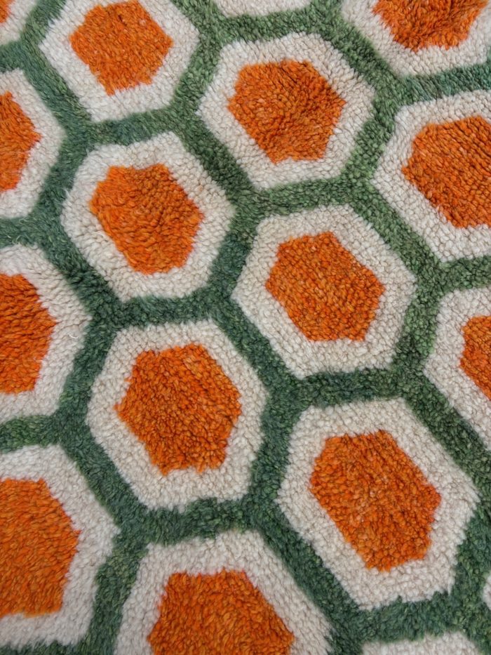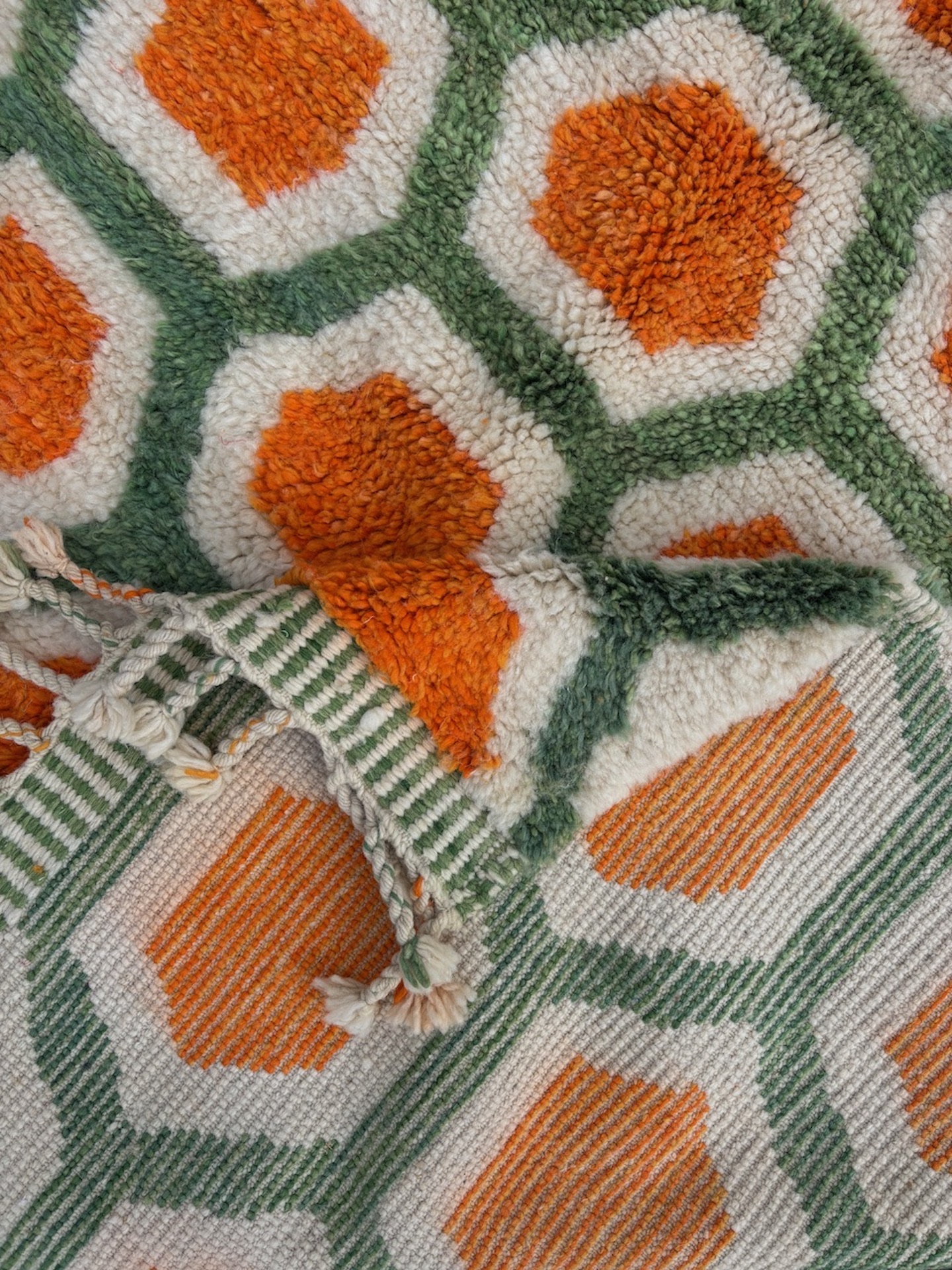 Sa forme graphique en orange et vert se détache sur un fond écru en laine naturelle, créant un contraste vibrant qui en fait une véritable pièce d’art pour le sol. Ce tapis unique marie savoir-faire traditionnel et design contemporain, parfait pour un intérieur élégant et original.