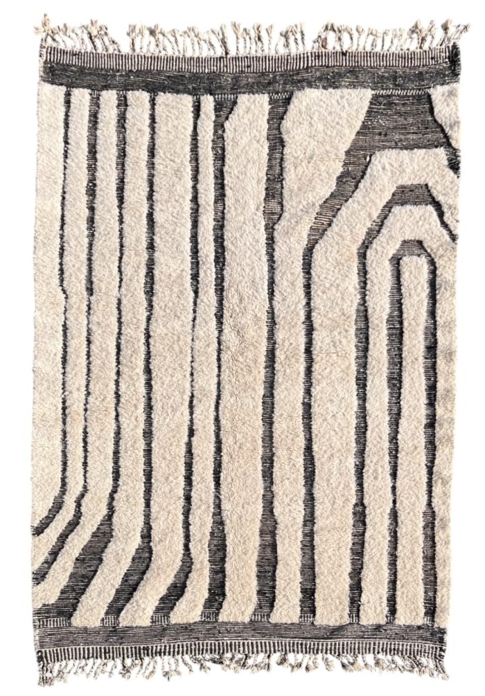 Son design graphique minimaliste, composé de lignes noires profondes sur fond écru naturel, apporte une esthétique à la fois contemporaine, élégante et intemporelle. Les motifs, volontairement irréguliers, témoignent du travail artisanal et confèrent à chaque tapis un caractère unique. Ce style épuré s’intègre parfaitement dans un intérieur moderne, minimaliste, bohème ou architectural.