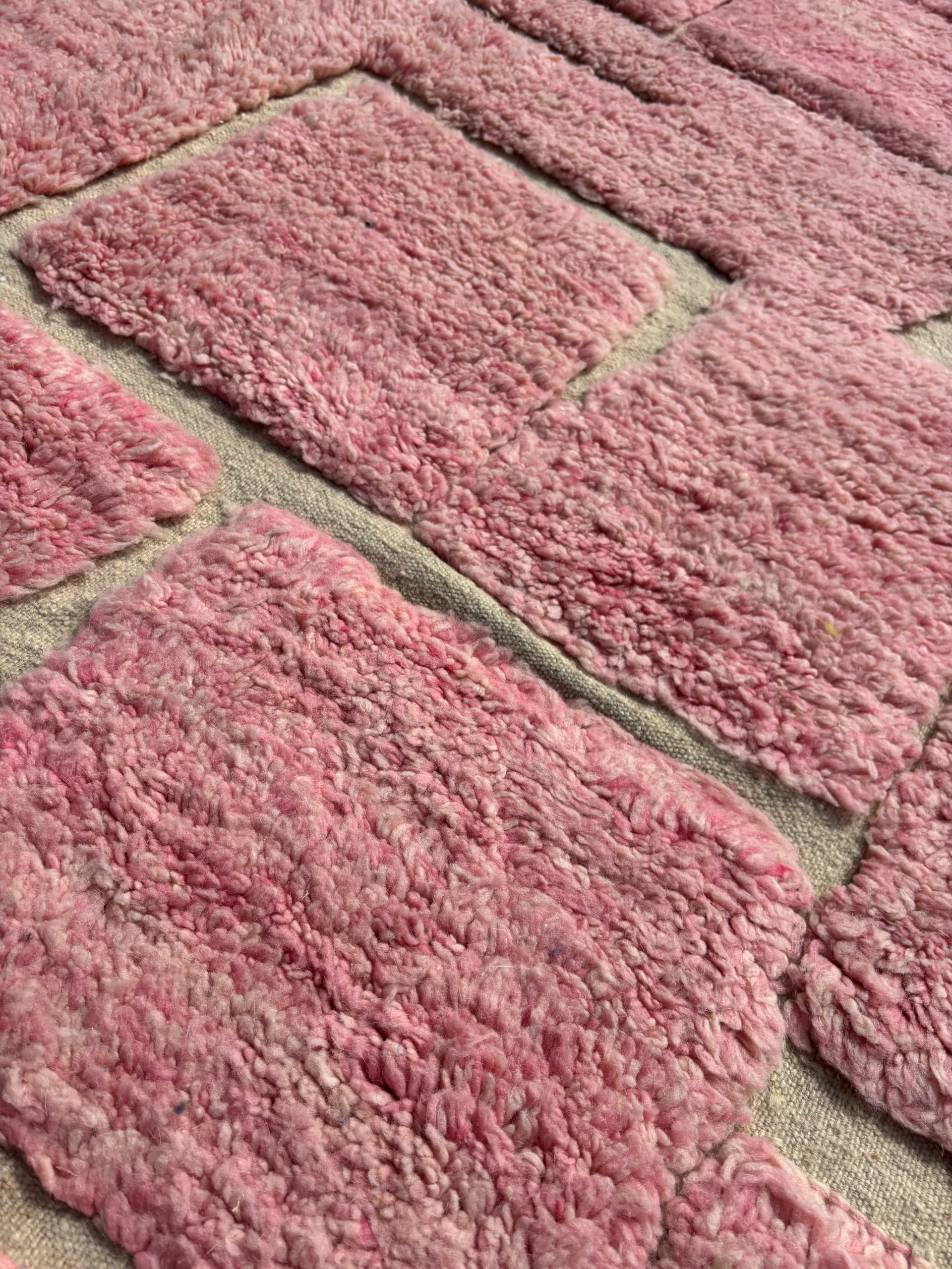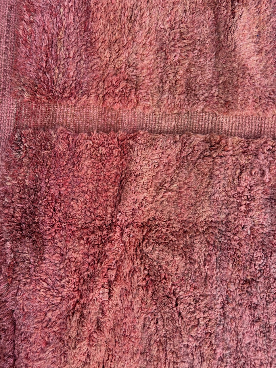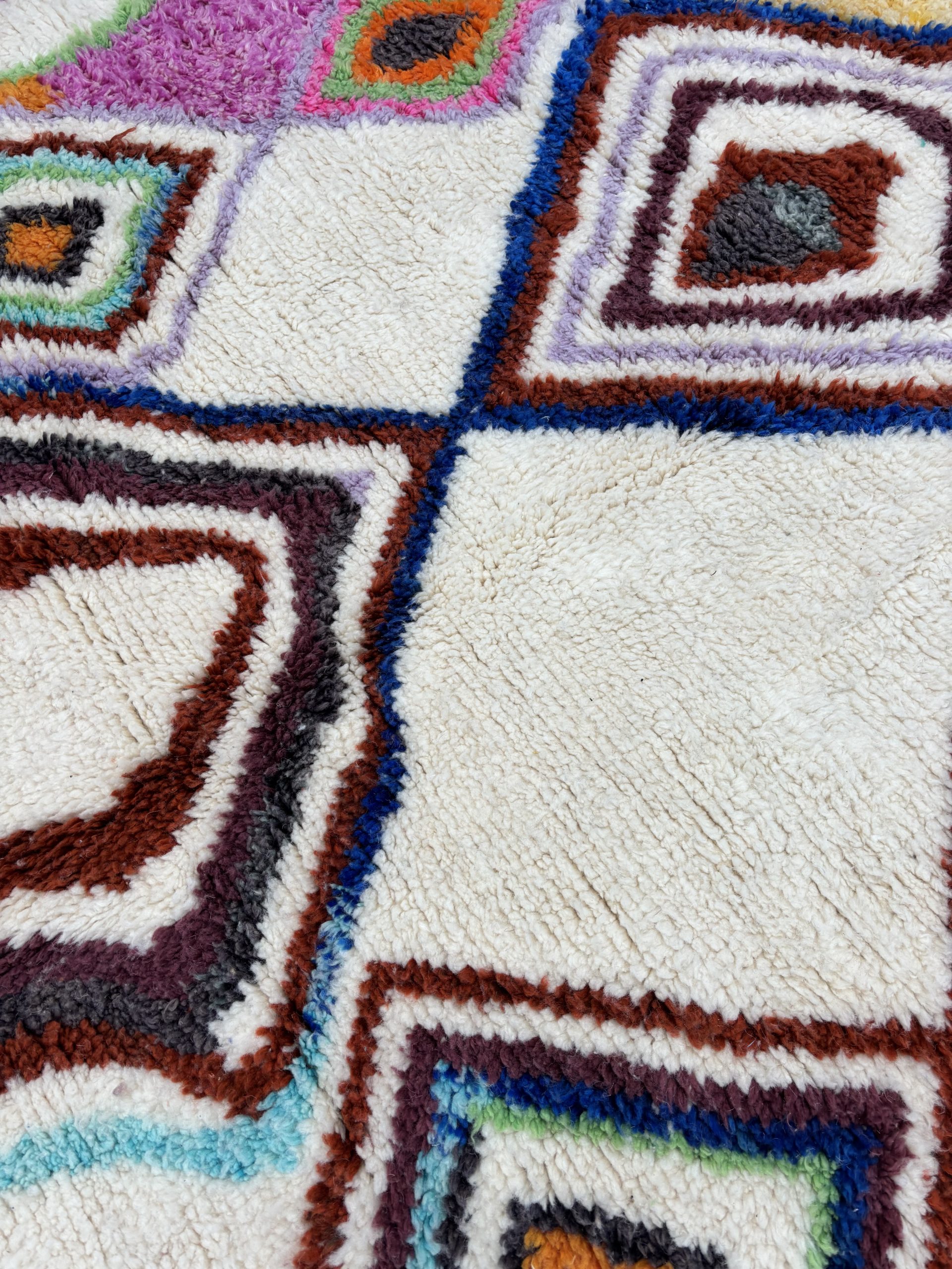 Même si à l’origine le tapis beni ouarain avait une taille extra large (dans le but de pouvoir couvrir l’ensemble de la tente berbère des tribus marocaine issus des montagnes de l’Atlas), afin de pouvoir apporter de la chaleur grâce à sa laine de moutons à poils longs (shaggy ou non), nous avons pu voir que les tisseuses avaient su s’adapter.