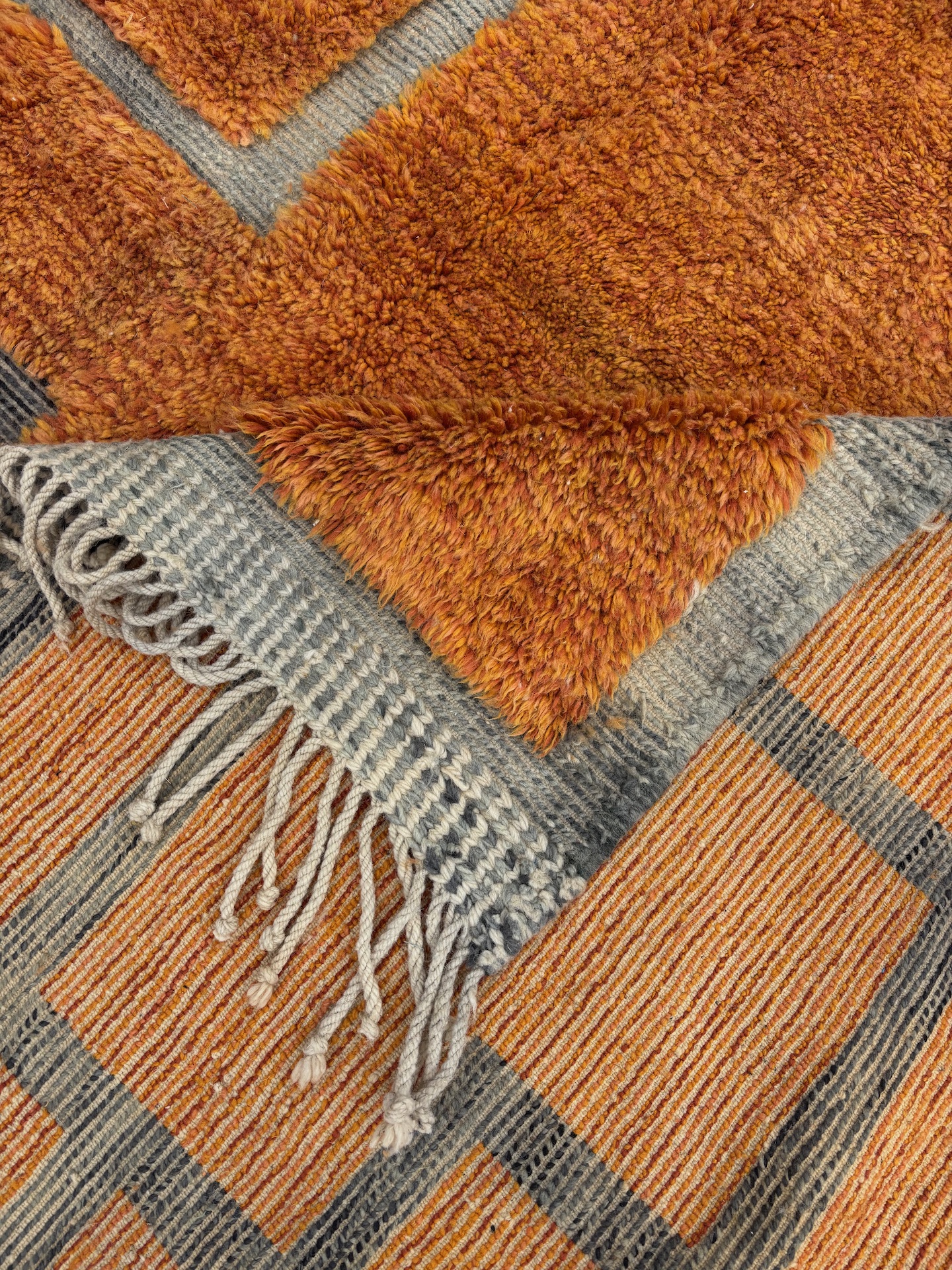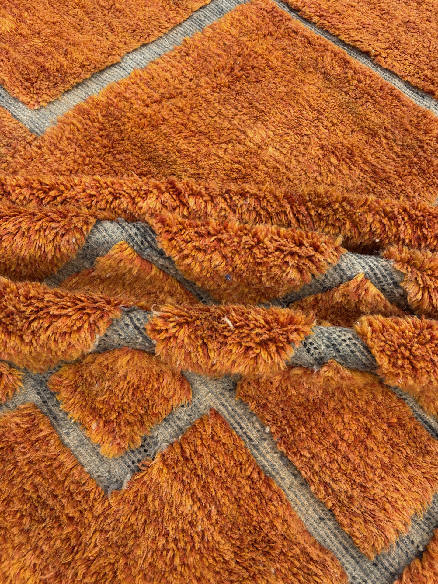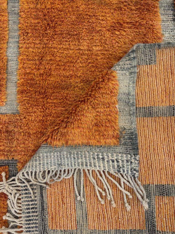 Le tapis Mrirt Orange est une pièce contemporaine d’exception, entièrement tissée à la main dans le Moyen Atlas marocain par des artisanes spécialisées dans la laine Mrirt de haute qualité.