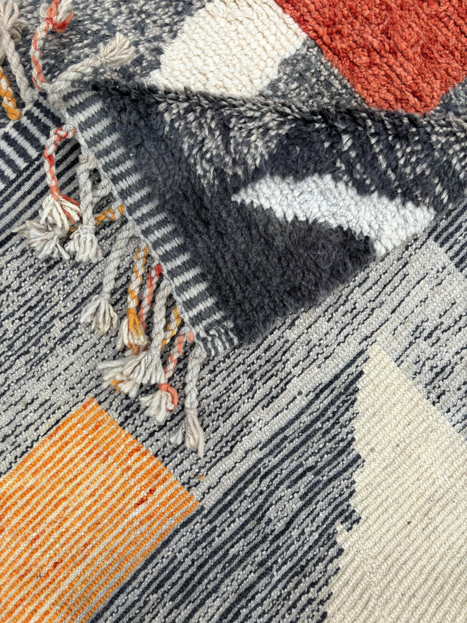 Entièrement tissé à la main, ce tapis est réalisé en laine naturelle de haute qualité, reconnue pour sa douceur, sa durabilité et son confort au quotidien.