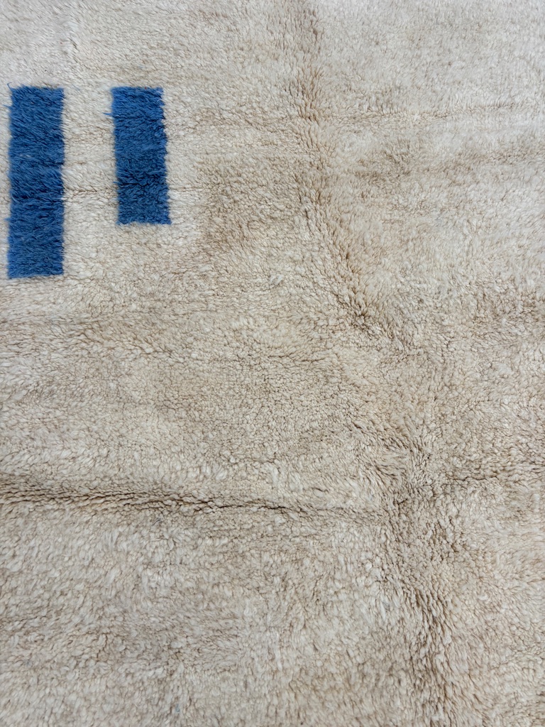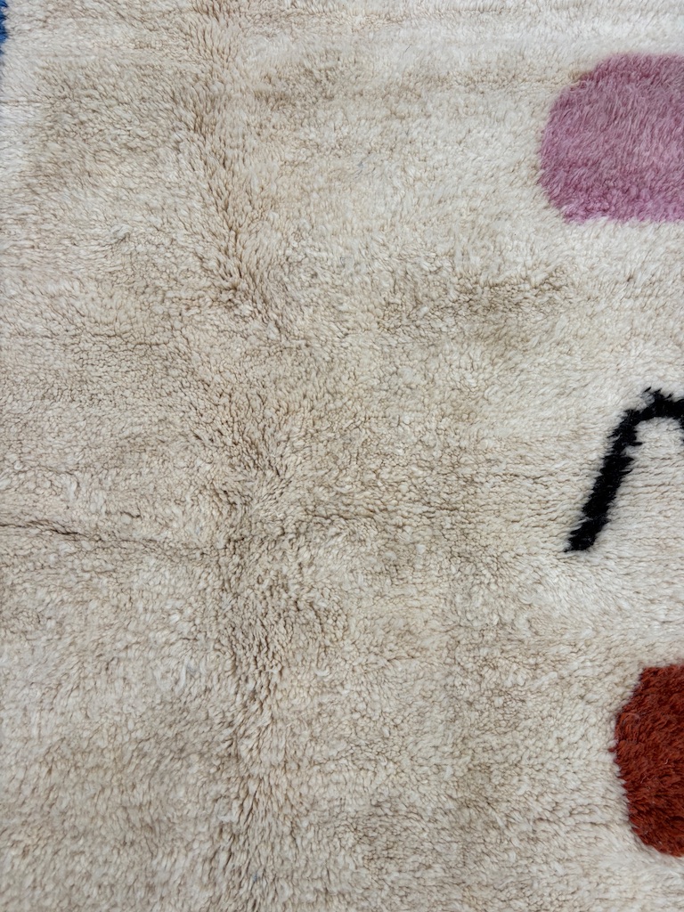 Ce tapis marocain Mrirt sur mesure séduit par son équilibre parfait entre minimalisme contemporain et artisanat berbère. Sa surface en laine écrue naturelle est ponctuée de motifs graphiques subtils et colorés, disposés avec justesse : lignes bleues verticales, touches ocre et noires, formes organiques rose poudré et terracotta. Un design doux, moderne et intemporel, pensé pour dialoguer avec l’espace sans jamais le surcharger.
