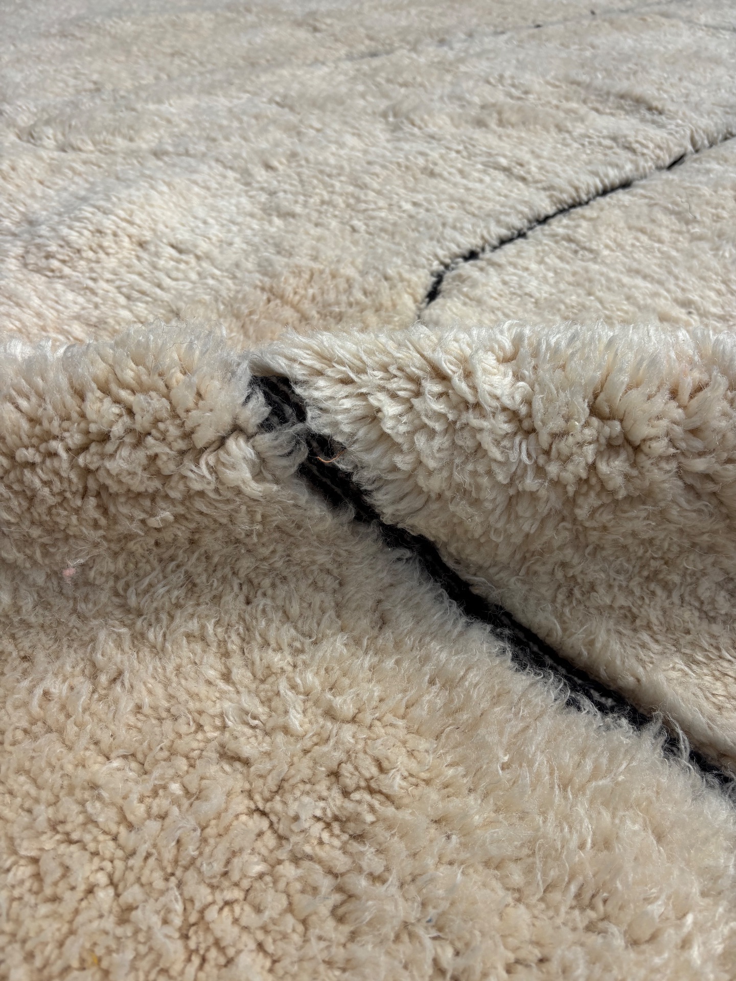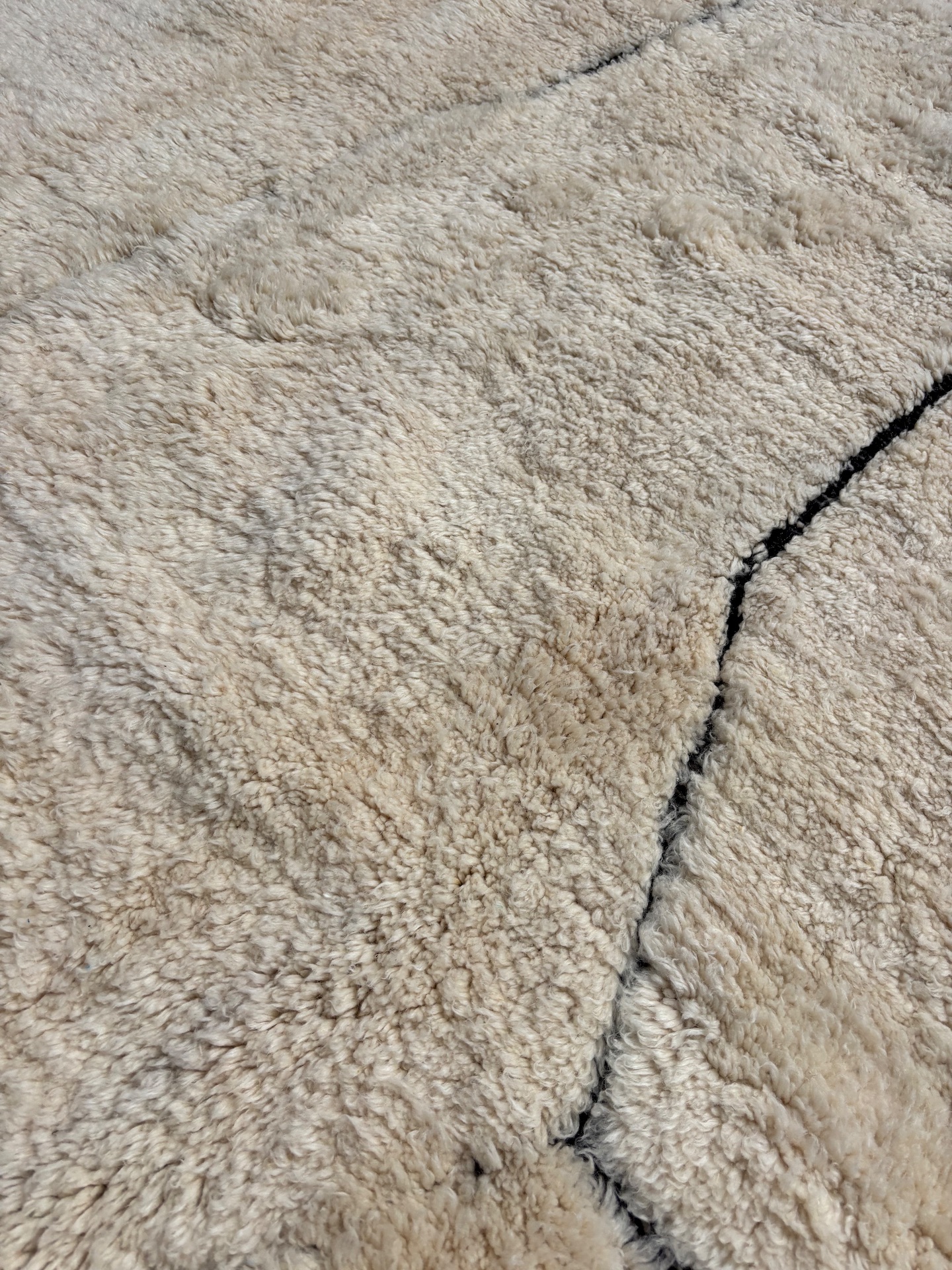 Ce tapis marocain Mrirt sur mesure incarne la rencontre entre le savoir-faire traditionnel berbère et une esthétique contemporaine inspirée de l’art abstrait. Tissé à la main dans les montagnes de l’Atlas, il se distingue par son fond écru lumineux, sa laine épaisse et moelleuse, et ses motifs graphiques structurés soulignés de lignes noires, de formes géométriques et de touches de couleurs chaleureuses : ocre, bordeaux et orange brûlé.