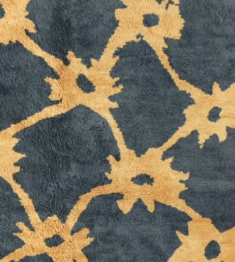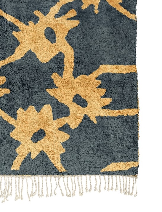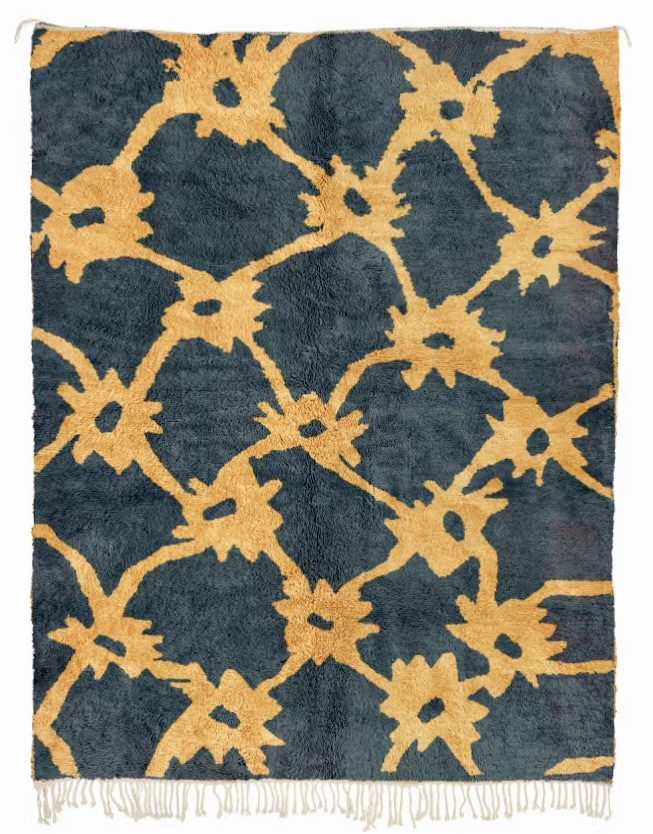LAZRAQ  est un tapis Mrirt contemporain au caractère fort, mêlant un bleu profond minéral à un motif solaire ocre doré, inspiré des symboles berbères revisités dans une lecture moderne et graphique.
