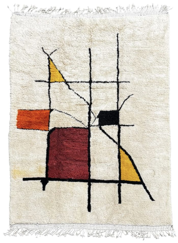 Ce tapis marocain Mrirt sur mesure incarne la rencontre entre le savoir-faire traditionnel berbère et une esthétique contemporaine inspirée de l’art abstrait. Tissé à la main dans les montagnes de l’Atlas, il se distingue par son fond écru lumineux, sa laine épaisse et moelleuse, et ses motifs graphiques structurés soulignés de lignes noires, de formes géométriques et de touches de couleurs chaleureuses : ocre, bordeaux et orange brûlé.