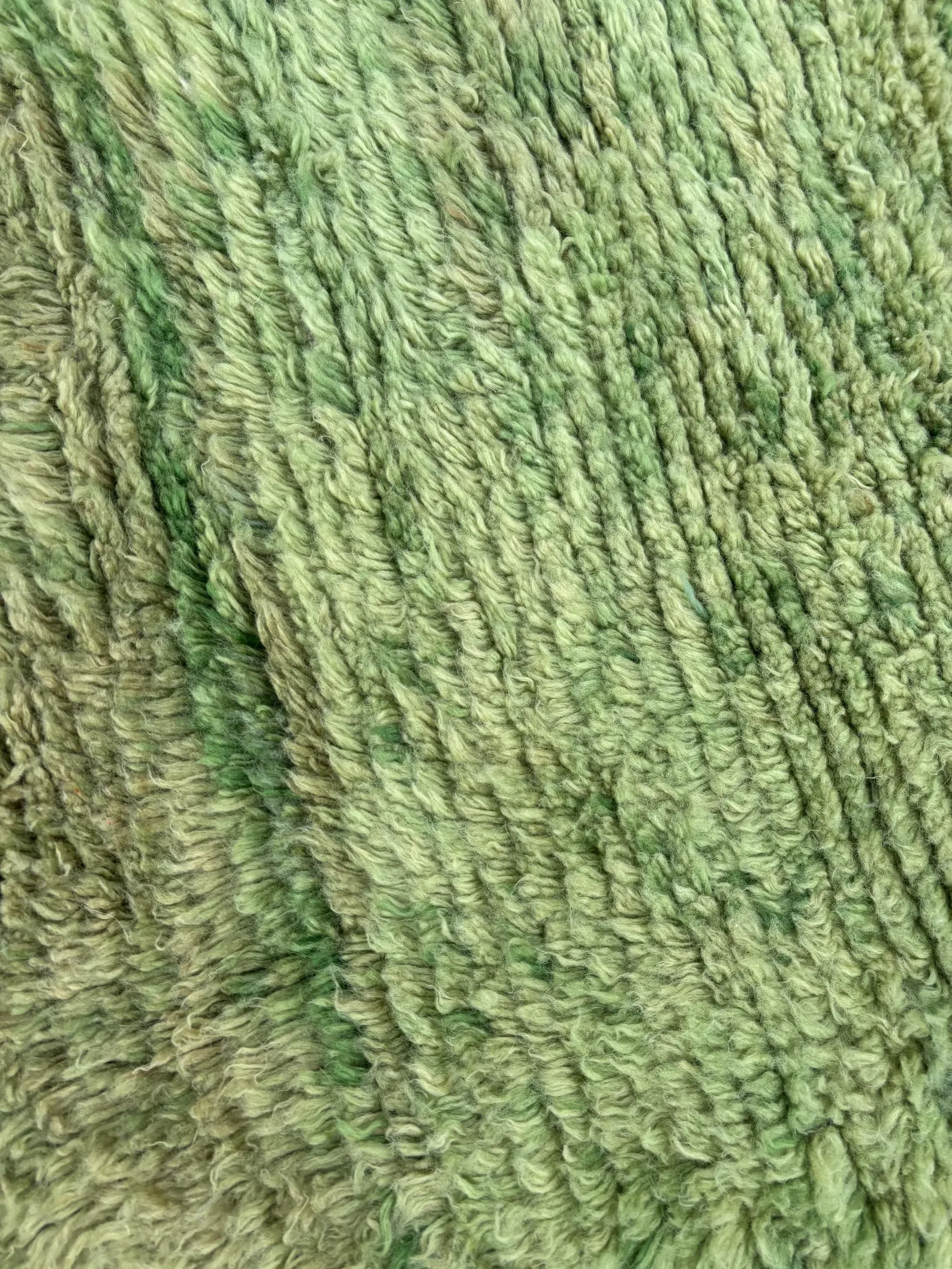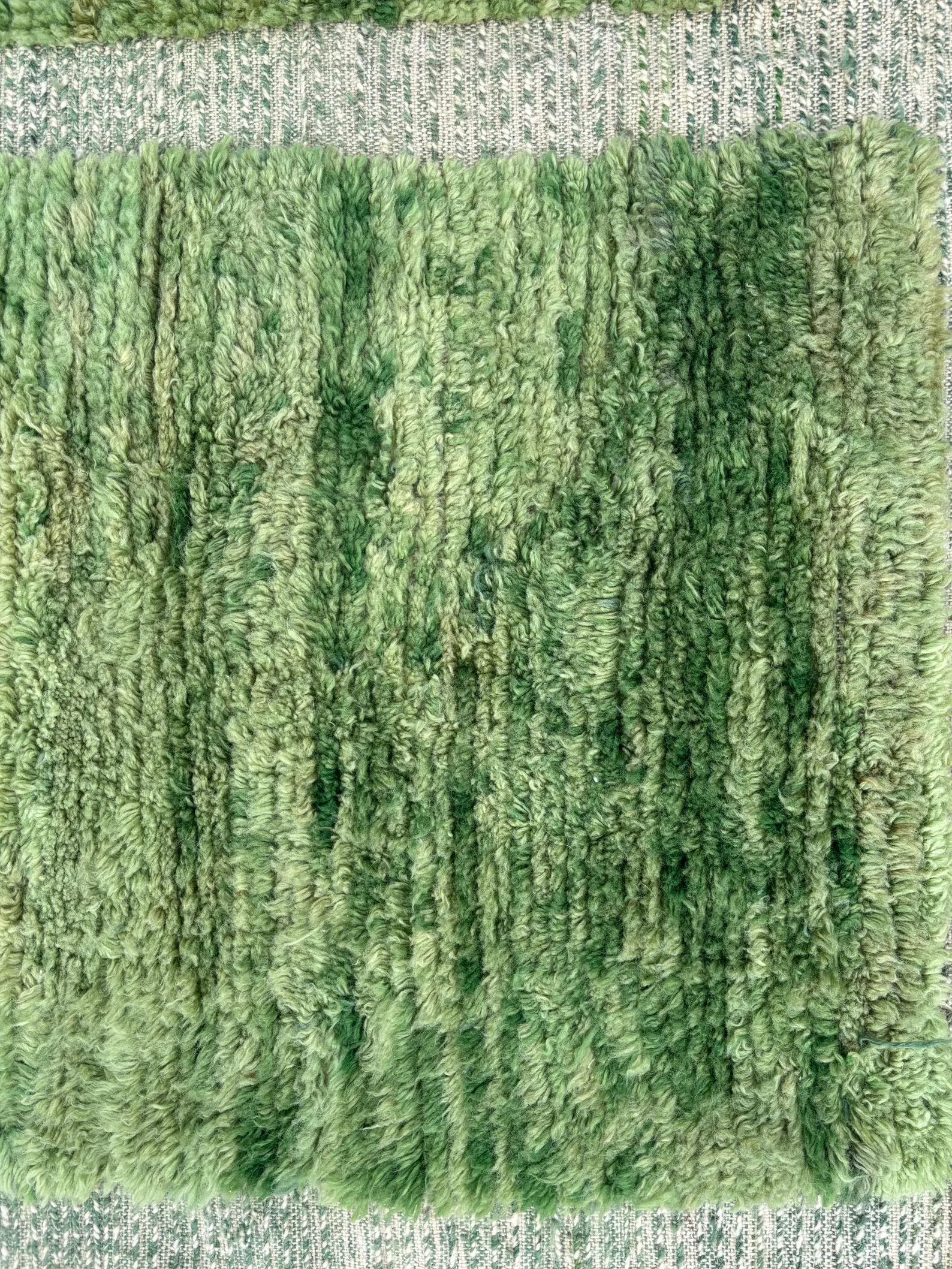 Les nuances de vert, subtiles et vibrantes, dialoguent avec la texture dense de la laine, créant un tapis à la fois apaisant, graphique et profondément organique.