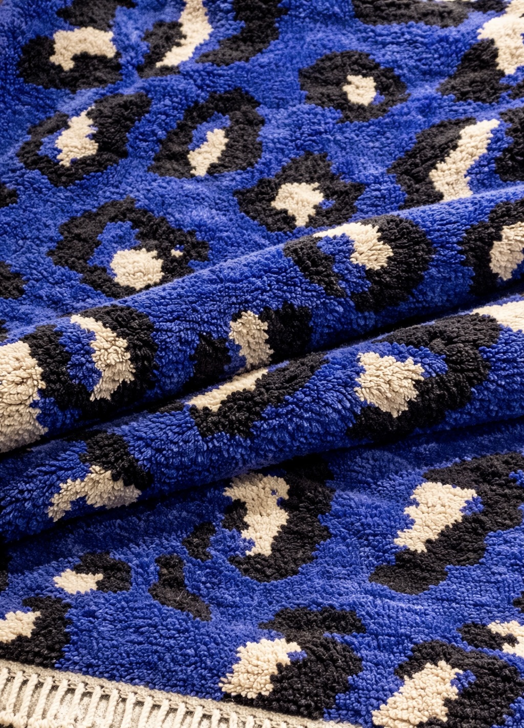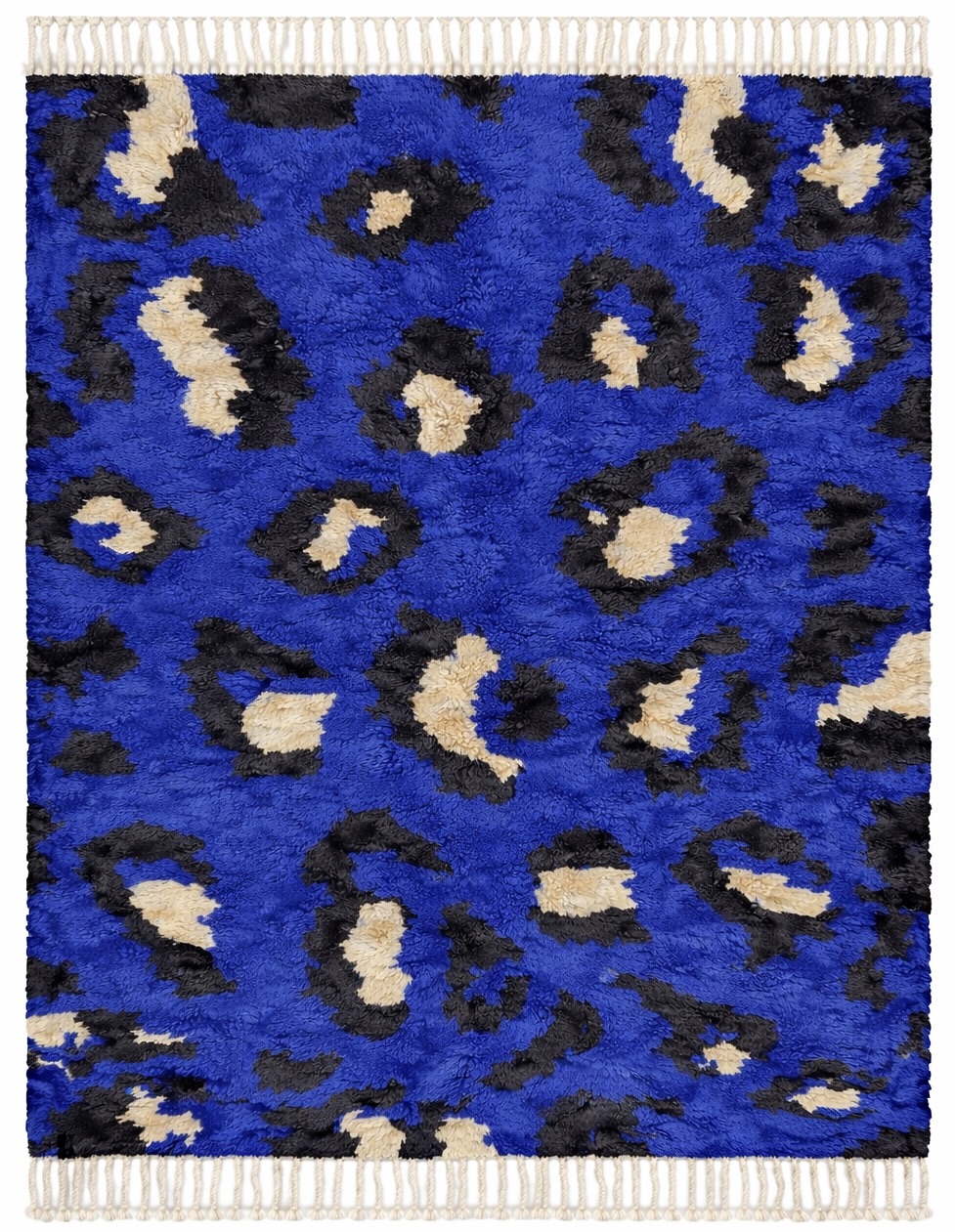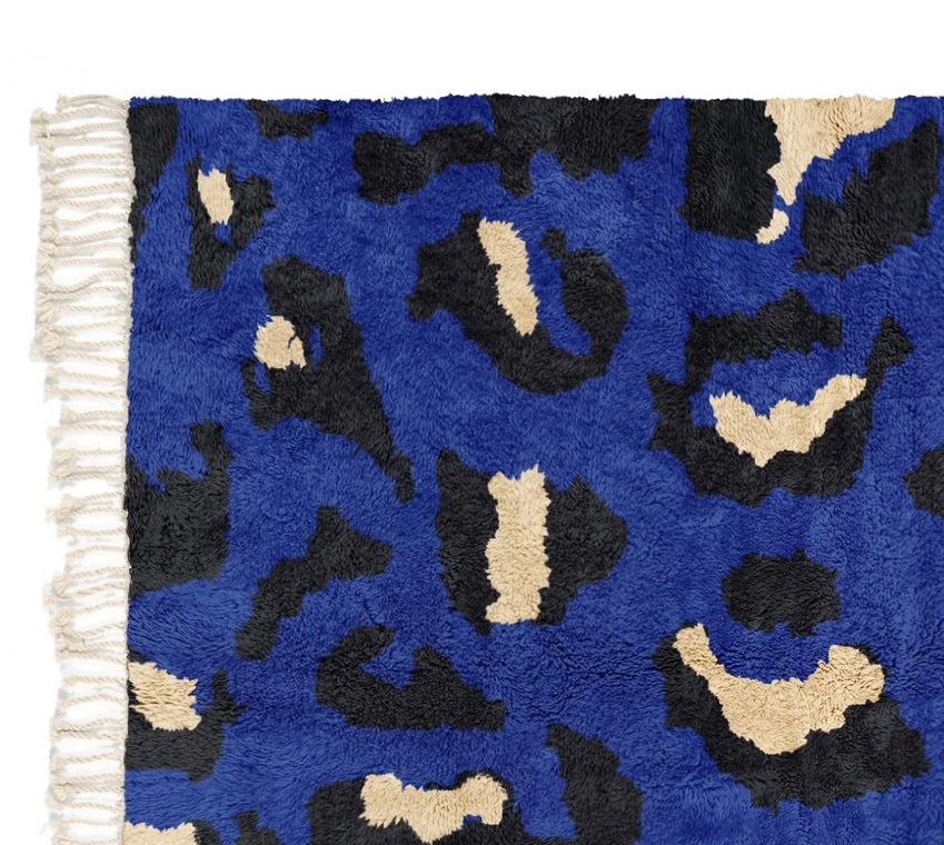 Le tapis Mrirt “Majorelle Sauvage” est une pièce forte, graphique et résolument moderne, inspirée de l’art berbère marocain et revisitée avec une audace contemporaine. Son fond bleu Majorelle intense, sublimé par des motifs organiques noirs et écrus, évoque une esthétique presque animale, à la fois sauvage et sophistiquée.