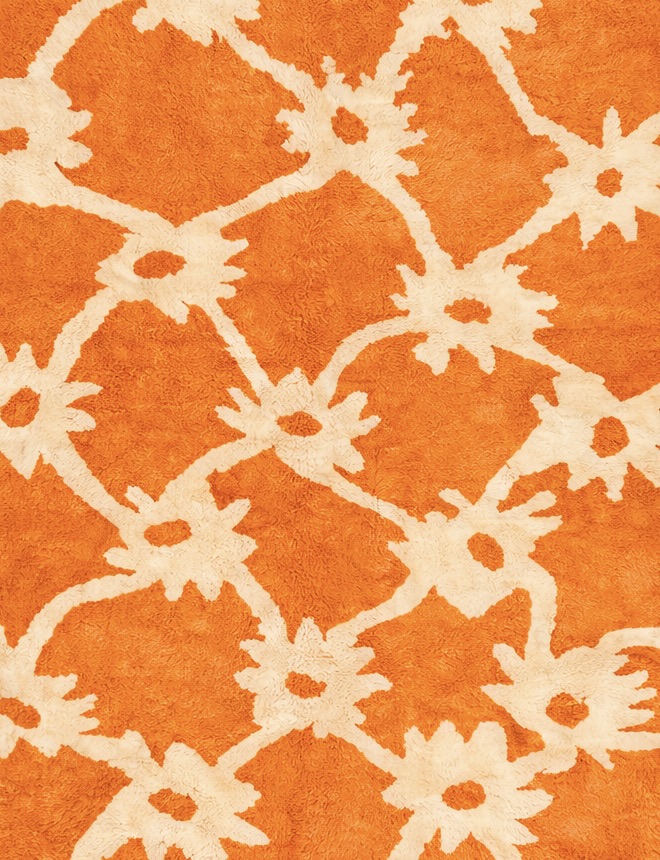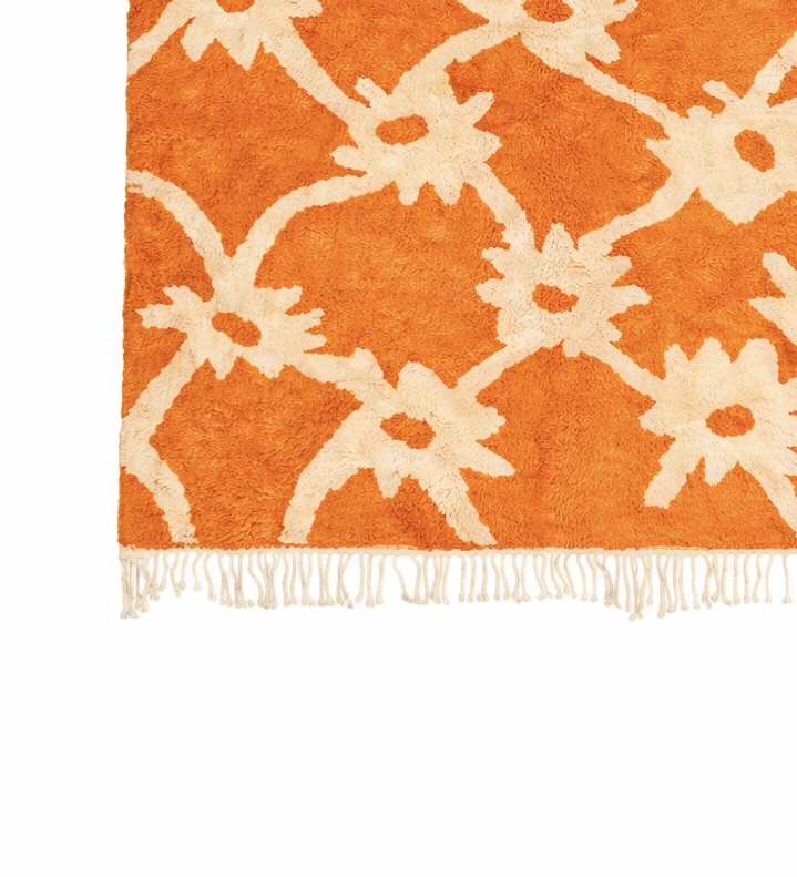 Le tapis Mrirt  est une célébration de la lumière et de la couleur. Son orange intense, chaleureux et vibrant, est contrasté par des motifs écrus organiques, dessinés à la main dans le respect de l’esthétique berbère. Le résultat est un tapis graphique, expressif et résolument contemporain.