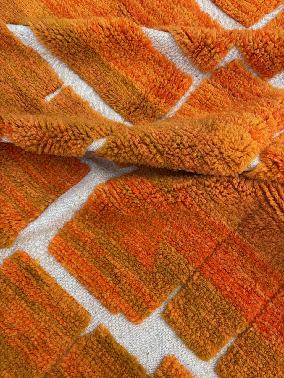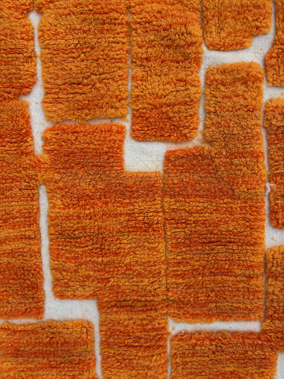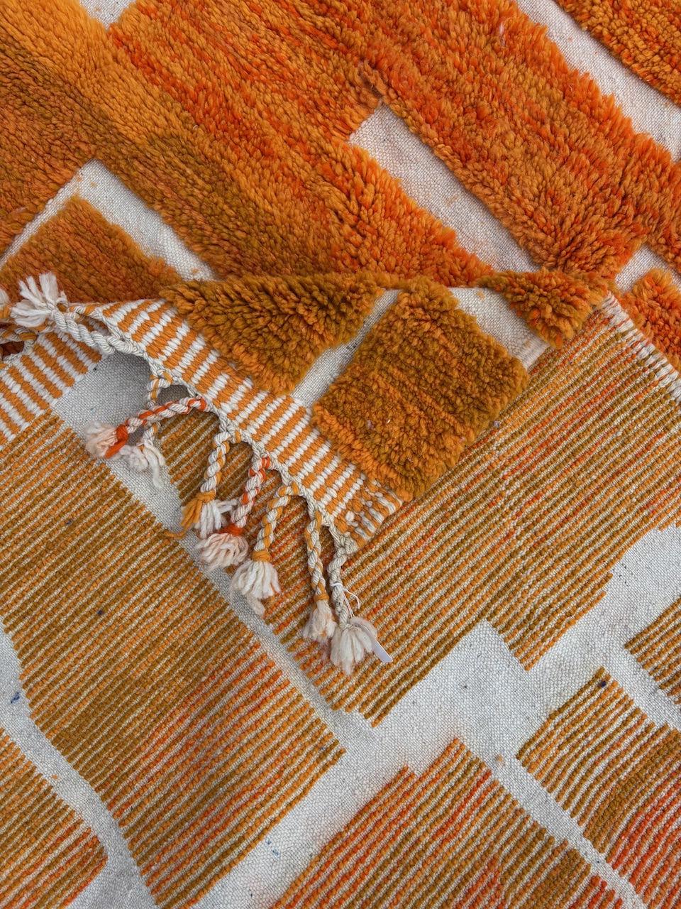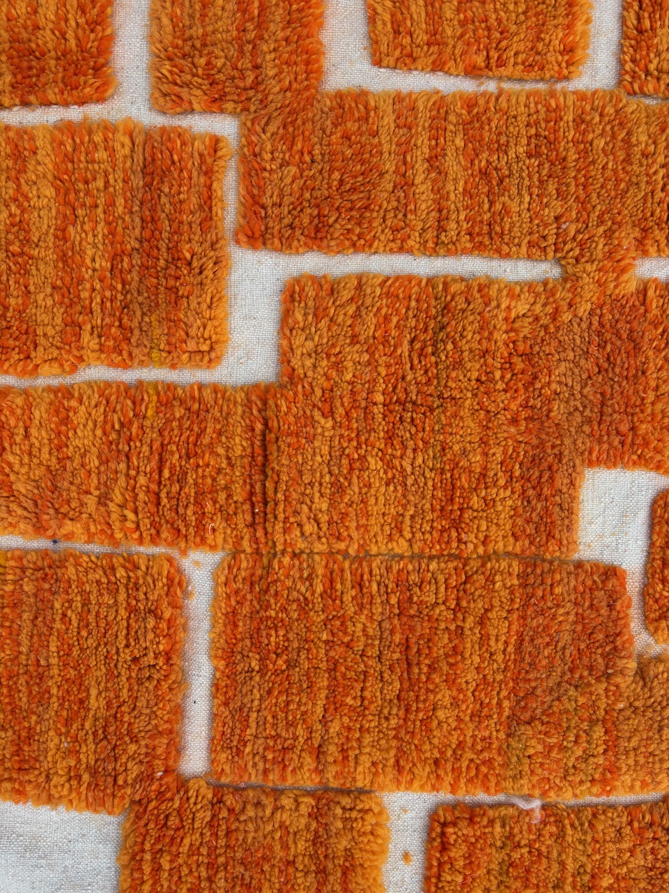 Ce modèle se caractérise par un motif graphique structuré, inspiré de formes architecturales et abstraites, dans une teinte orange chaleureuse et vibrante, parfaitement équilibrée par un fond écru naturel. Un tapis à la fois moderne, artistique et intemporel, idéal pour sublimer un intérieur contemporain, bohème ou minimaliste.